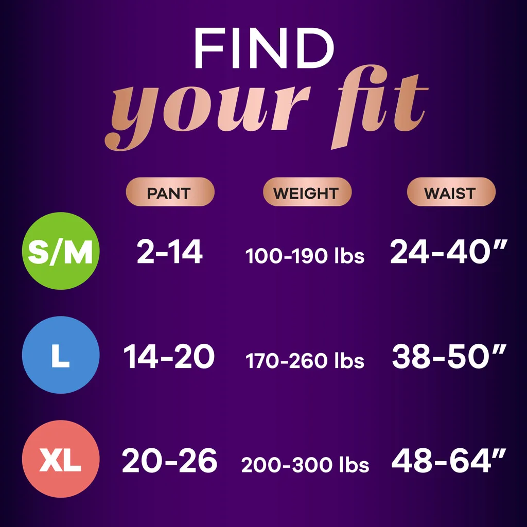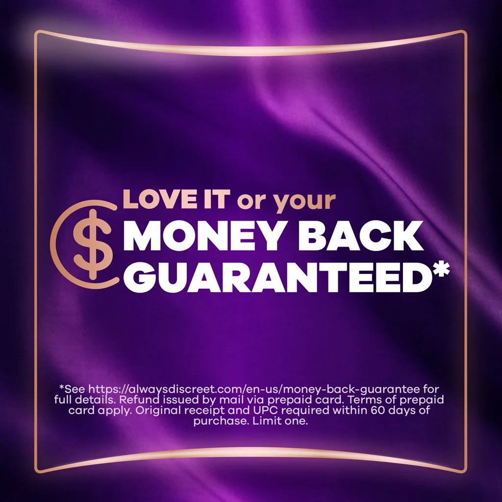 Looking for disposable women's incontinence underwear that gives you maximum protection and maximum comfort? Tired of bulky adult diapers that don't look and feel like "real" panties? Try Always Discreet Boutique Incontinence Underwear, which gives our most sophisticated fit along with a soft feel you'll love. The form-fitting design hugs a woman's curves with a soft, silk-like fabric so you can walk with poise and confidence. The ultra-thin core turns liquid to gel and locks away wetness in seconds for maximum protection that leaves you feeling secure for hours. Plus, these panties feature a special side LeakGuard to help stop leaks where they happen most: at the leg. Whether you have an overactive bladder or you're experiencing postpartum urine leaks, this disposable underwear can lock leaks and odor all day long. Get incredible and reliable protection with ladies' disposable Always Discreet incontinence underwear, available in sizes S/M – XL to fit all kinds of curves. Don't let leaks get in the way of your day, simply find your right size with the Always Discreet My Fit chart and get the protection you can depend on. Then, choose between two different yet equally stylish options - Black or Rosy - to better personalize your look.